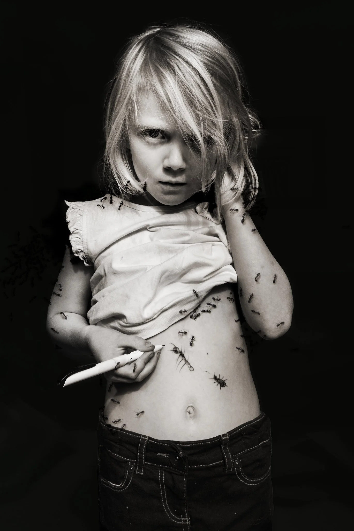Daisy and the ants was an image I created 8 years ago. It features my child, covered in ants. Making the truth more interesting, was an indulgent thought process I used when creating images. The image is a blend of a portrait of my child, and some ants we found in the garden, it's creation was prompted by a comment Daisy made when poorly "my skin feels like it's covered in ants". I can challenge the indexicality of this image, Daisy and the ants is not a photograph of my daughter it is not a photograph of ants, it is a photograph of a feeling, a sensation, which cannot be figuratively translated. Therefore I must adopt alternative practices, visual languages to represent.